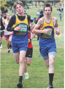 HAZEL SONES (above), Scobey High School sophomore, senior Tristan Lekvold below (left) and freshman Delbert Sones are shown in action at the 62nd annual State Cross Country Championships in Missoula Saturday, October 25. It needs to be noted Sones also competed in the 61st annual in Missoula, which was mistakenly omitted in last week’s issue of the Daniels County