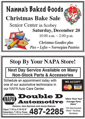 Nanna’s Baked GoodsChristmas Bake Sale Senior Center in ScobeySaturday, December 20 Stop By Your NAPA Store!Double D Automotive -