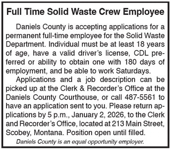 North Valley EMS of Opheim is planning an EMT course for up to twelve participants. Contact Tim Stenglein at 406-724-7272 by January 4. The cour...