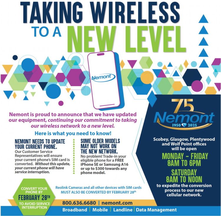 Nemont is proud to announce that we have updated our equipment, continuing our commitment to taking our wireless network to a new level. Here is what you need to know! Scobey, Glasgow, Plentywood and Wolf Point offices will be open NEMONT NEEDS TO UPDATE YOUR CURRENT PHONE. Our Customer Service Representatives will ensure your current phone’s SIM card is converted. Without this update, your current phone will have service interruption. SOME OLDER MODELS MAY NOT WORK ON THE NEW NETWORK. No problem! Trade-in your eligible phone for a FREE iPhone SE or Samsung A16 or up to $300 towards any phone model. Monday - Friday 8am to 6pm Saturday 8am to Noon to expedite the conversion process to our new cellular network. R Reolink Cameras and all other devices with SIM cards MUST ALSO BE CONVERTED BY FEBRUARY 28th FEbruary 28th 800.636.6680 nemont.com Broadband | Mobile | Landline | Data Management Nemont is proud to announce that we have updated our equipment, continuing our commitment to taking our wireless network to a new level. Here is what you need to know! Scobey, Glasgow, Plentywood and Wolf Point offices will be open NEMONT NEEDS TO UPDATE YOUR CURRENT PHONE. Our Customer Service Representatives will ensure your current phone’s SIM card is converted. Without this update, your current phone will have service interruption. SOME OLDER MODELS MAY NOT WORK ON THE NEW NETWORK. No problem! Trade-in your eligible phone for a FREE iPhone SE or Samsung A16 or up to $300 towards any phone model. Monday - Friday 8am to 6pm Saturday 8am to Noon to expedite the conversion process to our new cellular network. R Reolink Cameras and all other devices with SIM cards MUST ALSO BE CONVERTED BY FEBRUARY 28th FEbruary 28th 800.636.6680 nemont.com Broadband | Mobile | Landline | Data Management