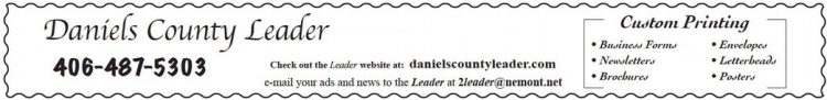 Custom Printing Daniels County Leader • Business Forms • Envelopes • Newsletters • Letterheads • Brochures • Posters 406-487-5303 Check out the Leader website at: danielscountyleader.com e-mail your ads and news to the Leader at 2leader@nemont.net Custom Printing Daniels County Leader • Business Forms • Envelopes • Newsletters • Letterheads • Brochures • Posters 406-487-5303 Check out the Leader website at: danielscountyleader.com e-mail your ads and news to the Leader at 2leader@nemont.net