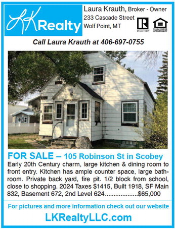 Laura Krauth, Broker - Owner 233 Cascade Street Wolf Point, MT Call Laura Krauth at 406-697-0755 FOR SALE – 105 Robinson St in Scobey Early 20th Century charm, large kitchen & dining room to front entry. Kitchen has ample counter space, large bathroom. Private back yard, fire pit. 1/2 block from school, close to shopping. 2024 Taxes $1415, Built 1918, SF Main 832, Basement 672, 2nd Level 624 ................... $65,000 For pictures and more information check out our website LKRealtyLLC.com Laura Krauth, Broker - Owner 233 Cascade Street Wolf Point, MT Call Laura Krauth at 406-697-0755 FOR SALE – 105 Robinson St in Scobey Early 20th Century charm, large kitchen & dining room to front entry. Kitchen has ample counter space, large bathroom. Private back yard, fire pit. 1/2 block from school, close to shopping. 2024 Taxes $1415, Built 1918, SF Main 832, Basement 672, 2nd Level 624 ................... $65,000 For pictures and more information check out our website LKRealtyLLC.com