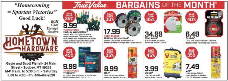 “Homecoming = Spartan Victories” Good Luck! SAVE OVER SAVE OVER SAVE OVER SAVE OVER 35% 30% 35% 40% BOM Good Through October 8.99 Holiday Wonderland YOUR CHOICE 17.99 YOUR CHOICE 34.99 6.49 100 ct. Mini LED Light Set: Warm White, Multicolor, Cool White, Red, Blue, Green with Green Wire, or Warm White or Multicolor with White Wire Holiday Wonderland First Alert Scotch 2-in-1 Smoke & Carbon Monoxide Alarm E 131 019 1 in. x 5 ft. Scotch-Mount™ Extreme Double-Sided Mounting Tape P 204 468 T 195 548, 549, 550, 551, 552, 553, 554, 557 200 ct. Cool White, Warm White or Multicolor Mini LED Light Set T 195 539, 540, 541 SAVE OVER SAVE OVER SAVE OVER SAVE OVER 45% 35% 45% 35% 9.99 7.49 Gayle and Scott Fishell• 24 Main Street • Scobey, MT 59263 M-F 8 a.m. to 5:30 p.m. • Saturday 8:00 to 4:00 • Ph. 406-487-2628 YOUR CHOICE 8.99 3.99 DAP TruGuard DAP Victor 10 x 12 ft. Blue or Hunter Green/Brown Multi-Purpose Tarp P 797 763, 777 12 oz. FireBreak Flame Resistant Sealant P 112 372 Live Catch & Hold Mouse Trap L 318 425 12 oz. Mouse Shield Foam Sealant & Blocker P 224 172 Not available in all areas. “Homecoming = Spartan Victories” Good Luck! SAVE OVER SAVE OVER SAVE OVER SAVE OVER 35% 30% 35% 40% BOM Good Through October 8.99 Holiday Wonderland YOUR CHOICE 17.99 YOUR CHOICE 34.99 6.49 100 ct. Mini LED Light Set: Warm White, Multicolor, Cool White, Red, Blue, Green with Green Wire, or Warm White or Multicolor with White Wire Holiday Wonderland First Alert Scotch 2-in-1 Smoke & Carbon Monoxide Alarm E 131 019 1 in. x 5 ft. Scotch-Mount™ Extreme Double-Sided Mounting Tape P 204 468 T 195 548, 549, 550, 551, 552, 553, 554, 557 200 ct. Cool White, Warm White or Multicolor Mini LED Light Set T 195 539, 540, 541 SAVE OVER SAVE OVER SAVE OVER SAVE OVER 45% 35% 45% 35% 9.99 7.49 Gayle and Scott Fishell• 24 Main Street • Scobey, MT 59263 M-F 8 a.m. to 5:30 p.m. • Saturday 8:00 to 4:00 • Ph. 406-487-2628 YOUR CHOICE 8.99 3.99 DAP TruGuard DAP Victor 10 x 12 ft. Blue or Hunter Green/Brown Multi-Purpose Tarp P 797 763, 777 12 oz. FireBreak Flame Resistant Sealant P 112 372 Live Catch & Hold Mouse Trap L 318 425 12 oz. Mouse Shield Foam Sealant & Blocker P 224 172 Not available in all areas.