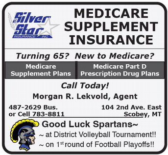 MEDICARE SUPPLEMENT INSURANCE Turning 65? New to Medicare? Medicare Supplement Plans Medicare Part D Prescription Drug Plans Call Today! Morgan R. Lekvold, Agent 487-2629 Bus. or Cell 783-8811 104 2nd Ave. East Scobey, MT Good Luck Spartans~ ~ at District Volleyball Tournament!! ~ on 1st round of Football Playoffs!! MEDICARE SUPPLEMENT INSURANCE Turning 65? New to Medicare? Medicare Supplement Plans Medicare Part D Prescription Drug Plans Call Today! Morgan R. Lekvold, Agent 487-2629 Bus. or Cell 783-8811 104 2nd Ave. East Scobey, MT Good Luck Spartans~ ~ at District Volleyball Tournament!! ~ on 1st round of Football Playoffs!!