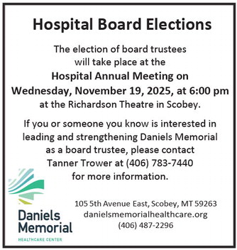 Hospital Board Elections The election of board trustees will take place at the Hospital Annual Meeting on Wednesday, November 19, 2025, at 6:00 pm at the Richardson Theatre in Scobey. If you or someone you know is interested in leading and strengthening Daniels Memorial as a board trustee, please contact Tanner Trower at (406) 783-7440 for more information. 105 5th Avenue East, Scobey, MT 59263 danielsmemorialhealthcare.org (406) 487-2296 Hospital Board Elections The election of board trustees will take place at the Hospital Annual Meeting on Wednesday, November 19, 2025, at 6:00 pm at the Richardson Theatre in Scobey. If you or someone you know is interested in leading and strengthening Daniels Memorial as a board trustee, please contact Tanner Trower at (406) 783-7440 for more information. 105 5th Avenue East, Scobey, MT 59263 danielsmemorialhealthcare.org (406) 487-2296