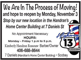 We Are In The Process of Moving! and hope to reopen by Monday, November 3 Stop by our new location in the Handran’s Home Center Building at 7 Daniels St No Appointment Necessary HOURS: Monday - Friday 1 p.m to 5 p.m. Kimberly Handran Rossouw Barber/Owner 406-688-8644 7 Daniels (Handran’s Home Center Building) • Scobey We Are In The Process of Moving! and hope to reopen by Monday, November 3 Stop by our new location in the Handran’s Home Center Building at 7 Daniels St No Appointment Necessary HOURS: Monday - Friday 1 p.m to 5 p.m. Kimberly Handran Rossouw Barber/Owner 406-688-8644 7 Daniels (Handran’s Home Center Building) • Scobey