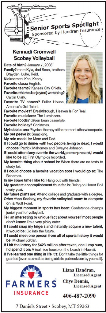 Senior Sports Spotlight Sponsored by Handran Insurance Kennadi Cromwell Scobey Volleyball Date of birth? January 7, 2008 Family? mom Kyla, dad Sean, brothers Brayden, Luke, Reid. Nicknames: Ken, Kenny. Favorite class: English. Favorite teams? Kansas City Chiefs. FavoriteathletesIenjoy(ed)watching? Caitlin Clark. Favorite TV shows? Fuller House, America’s Got Talent. Favorite movies? Breakthrough, Heaven Is For Real. Favorite musicians: The Lumineers. Favorite foods? Green bean casserole. Favorite holiday? Christmas. Myhobbiesare: Physicaltherapyatthemomentotherwisesports. My pet peeve is: Smacking. My role model is: Mom and Dad. If I could go to dinner with two people, living or dead, I would choose: Patrick Mahomes and Dwayne Johnson. If I could attend any event in the world, past or present, I would like to be at: First Olympics recorded. My favorite thing about school is: When there are no tests to study for. If I could choose a favorite vacation spot I would go to: The Bahamas. In my spare time I like to: Hang out with friends. My greatest accomplishment thus far is: Being on Honor Roll every year. My future plans are: Attend college and graduate with a degree. Other than Scobey, my favorite volleyball court to compete on is: Wolf Point. My biggest moment in sports has been: Conference champs junior year for volleyball. Tell an interesting or unique fact about yourself most people don’t know: I’m a very picky eater. If I could snap my fingers and instantly acquire a new talent, it would be: Go into the future. If I could meet one person from all of sports history it would be: Michael Jordan. If I hit the lottery for $423 million after taxes, one lump sum, I’d spend it on: A real nice house on the beach in Hawaii. If I’ve learned one thing in life it’s: Don’t take the little things for granted (even as small as being able to put socks on by yourself). Liana Handran, Licensed Agent Chye Dennis, Licensed Agent 406-487-2090 7 Daniels Street • Scobey, MT 59263 Senior Sports Spotlight Sponsored by Handran Insurance Kennadi Cromwell Scobey Volleyball Date of birth? January 7, 2008 Family? mom Kyla, dad Sean, brothers Brayden, Luke, Reid. Nicknames: Ken, Kenny. Favorite class: English. Favorite teams? Kansas City Chiefs. FavoriteathletesIenjoy(ed)watching? Caitlin Clark. Favorite TV shows? Fuller House, America’s Got Talent. Favorite movies? Breakthrough, Heaven Is For Real. Favorite musicians: The Lumineers. Favorite foods? Green bean casserole. Favorite holiday? Christmas. Myhobbiesare: Physicaltherapyatthemomentotherwisesports. My pet peeve is: Smacking. My role model is: Mom and Dad. If I could go to dinner with two people, living or dead, I would choose: Patrick Mahomes and Dwayne Johnson. If I could attend any event in the world, past or present, I would like to be at: First Olympics recorded. My favorite thing about school is: When there are no tests to study for. If I could choose a favorite vacation spot I would go to: The Bahamas. In my spare time I like to: Hang out with friends. My greatest accomplishment thus far is: Being on Honor Roll every year. My future plans are: Attend college and graduate with a degree. Other than Scobey, my favorite volleyball court to compete on is: Wolf Point. My biggest moment in sports has been: Conference champs junior year for volleyball. Tell an interesting or unique fact about yourself most people don’t know: I’m a very picky eater. If I could snap my fingers and instantly acquire a new talent, it would be: Go into the future. If I could meet one person from all of sports history it would be: Michael Jordan. If I hit the lottery for $423 million after taxes, one lump sum, I’d spend it on: A real nice house on the beach in Hawaii. If I’ve learned one thing in life it’s: Don’t take the little things for granted (even as small as being able to put socks on by yourself). Liana Handran, Licensed Agent Chye Dennis, Licensed Agent 406-487-2090 7 Daniels Street • Scobey, MT 59263