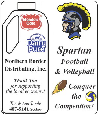 Spartan Football & Volleyball Conquer Northern Border Distributing, Inc. Thank You for supporting the local economy! the Tim & Ami Tande Competition! 487-5141 Scobey Spartan Football & Volleyball Conquer Northern Border Distributing, Inc. Thank You for supporting the local economy! the Tim & Ami Tande Competition! 487-5141 Scobey