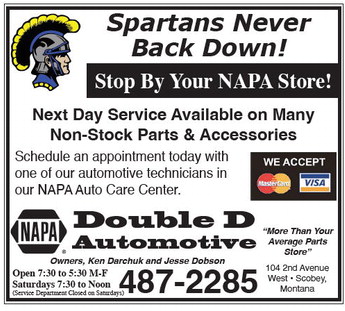 Spartans Never Back Down! Stop By Your NAPA Store! Next Day Service Available on Many Non-Stock Parts & Accessories Schedule an appointment today with one of our automotive technicians in our NAPA Auto Care Center. Double D Automotive Owners, Ken Darchuk and Jesse Dobson “More Than Your Average Parts Store” 104 2nd Avenue West • Scobey, Montana Open 7:30 to 5:30 M-F Saturdays 7:30 to Noon (Service Department Closed on Saturdays) 487-2285 Spartans Never Back Down! Stop By Your NAPA Store! Next Day Service Available on Many Non-Stock Parts & Accessories Schedule an appointment today with one of our automotive technicians in our NAPA Auto Care Center. Double D Automotive Owners, Ken Darchuk and Jesse Dobson “More Than Your Average Parts Store” 104 2nd Avenue West • Scobey, Montana Open 7:30 to 5:30 M-F Saturdays 7:30 to Noon (Service Department Closed on Saturdays) 487-2285