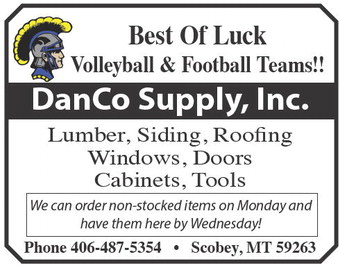 Best Of Luck Volleyball & Football Teams!! DanCo Supply, Inc. Lumber, Siding, Roofing Windows, Doors Cabinets, Tools Phone 406-487-5354 • Scobey, MT 59263 We can order non-stocked items on Monday and have them here by Wednesday! Best Of Luck Volleyball & Football Teams!! DanCo Supply, Inc. Lumber, Siding, Roofing Windows, Doors Cabinets, Tools Phone 406-487-5354 • Scobey, MT 59263 We can order non-stocked items on Monday and have them here by Wednesday!