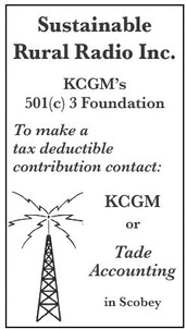 Sustainable Rural Radio Inc. KCGM’s 501(c) 3 Foundation To make a tax deductible contribution contact: KCGM or Tade Accounting in Scobey Sustainable Rural Radio Inc. KCGM’s 501(c) 3 Foundation To make a tax deductible contribution contact: KCGM or Tade Accounting in Scobey