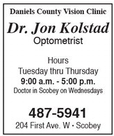 Daniels County Vision Clinic Dr. Jon Kolstad Optometrist Hours Tuesday thru Thursday 9:00 a.m. - 5:00 p.m. Doctor in Scobey on Wednesdays 487-5941 204 First Ave. W • Scobey Daniels County Vision Clinic Dr. Jon Kolstad Optometrist Hours Tuesday thru Thursday 9:00 a.m. - 5:00 p.m. Doctor in Scobey on Wednesdays 487-5941 204 First Ave. W • Scobey