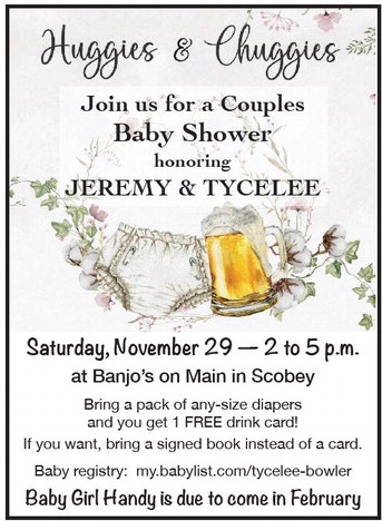 Join us for a Couples Baby Shower honoring JEREMY & TYCELEE Saturday, November 29 — 2 to 5 p.m. at Banjo’s on Main in Scobey Bring a pack of any-size diapers and you get 1 FREE drink card! If you want, bring a signed book instead of a card. Baby registry: my.babylist.com/tycelee-bowler Baby Girl Handy is due to come in February Join us for a Couples Baby Shower honoring JEREMY & TYCELEE Saturday, November 29 — 2 to 5 p.m. at Banjo’s on Main in Scobey Bring a pack of any-size diapers and you get 1 FREE drink card! If you want, bring a signed book instead of a card. Baby registry: my.babylist.com/tycelee-bowler Baby Girl Handy is due to come in February