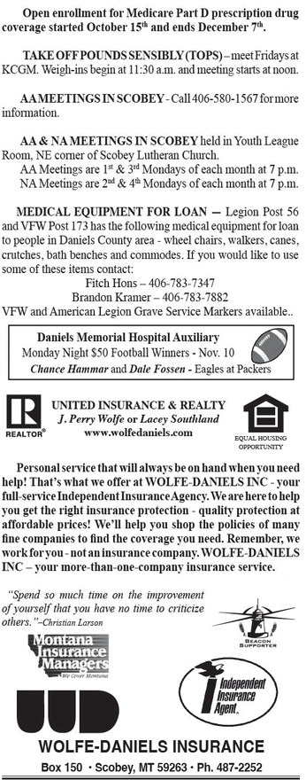 Open enrollment for Medicare Part D prescription drug coverage started October 15th and ends December 7th. TAKEOFFPOUNDSSENSIBLY(TOPS)– meet Fridays at KCGM. Weigh-ins begin at 11:30 a.m. and meeting starts at noon. AAMEETINGSINSCOBEY- Call 406-580-1567 for more information. AA& NAMEETINGS IN SCOBEY held in Youth League Room, NE corner of Scobey Lutheran Church. AA Meetings are 1st & 3rd Mondays of each month at 7 p.m. NA Meetings are 2nd & 4th Mondays of each month at 7 p.m. MEDICAL EQUIPMENT FOR LOAN — Legion Post 56 and VFW Post 173 has the following medical equipment for loan to people in Daniels County area - wheel chairs, walkers, canes, crutches, bath benches and commodes. If you would like to use some of these items contact: Fitch Hons – 406-783-7347 Brandon Kramer – 406-783-7882 VFW and American Legion Grave Service Markers available.. Daniels Memorial Hospital Auxiliary Monday Night $50 Football Winners - Nov. 10 Chance Hammar and Dale Fossen - Eagles at Packers UNITED INSURANCE & REALTY J. Perry Wolfe or Lacey Southland www.wolfedaniels.com EQUAL HOUSING OPPORTUNITY Personal service that will always be on hand when you need help! That’s what we offer at WOLFE-DANIELS INC - your full-service Independent InsuranceAgency.Weare hereto help you get the right insurance protection - quality protection at affordable prices! We’ll help you shop the policies of many fine companies to find the coverage you need. Remember, we workforyou-notaninsurancecompany.WOLFE-DANIELS INC – your more-than-one-company insurance service. “Spend so much time on the improvement of yourself that you have no time to criticize others.”–Christian Larson WOLFE-DANIELS INSURANCE Box 150 • Scobey, MT 59263 • Ph. 487-2252 Open enrollment for Medicare Part D prescription drug coverage started October 15th and ends December 7th. TAKEOFFPOUNDSSENSIBLY(TOPS)– meet Fridays at KCGM. Weigh-ins begin at 11:30 a.m. and meeting starts at noon. AAMEETINGSINSCOBEY- Call 406-580-1567 for more information. AA& NAMEETINGS IN SCOBEY held in Youth League Room, NE corner of Scobey Lutheran Church. AA Meetings are 1st & 3rd Mondays of each month at 7 p.m. NA Meetings are 2nd & 4th Mondays of each month at 7 p.m. MEDICAL EQUIPMENT FOR LOAN — Legion Post 56 and VFW Post 173 has the following medical equipment for loan to people in Daniels County area - wheel chairs, walkers, canes, crutches, bath benches and commodes. If you would like to use some of these items contact: Fitch Hons – 406-783-7347 Brandon Kramer – 406-783-7882 VFW and American Legion Grave Service Markers available.. Daniels Memorial Hospital Auxiliary Monday Night $50 Football Winners - Nov. 10 Chance Hammar and Dale Fossen - Eagles at Packers UNITED INSURANCE & REALTY J. Perry Wolfe or Lacey Southland www.wolfedaniels.com EQUAL HOUSING OPPORTUNITY Personal service that will always be on hand when you need help! That’s what we offer at WOLFE-DANIELS INC - your full-service Independent InsuranceAgency.Weare hereto help you get the right insurance protection - quality protection at affordable prices! We’ll help you shop the policies of many fine companies to find the coverage you need. Remember, we workforyou-notaninsurancecompany.WOLFE-DANIELS INC – your more-than-one-company insurance service. “Spend so much time on the improvement of yourself that you have no time to criticize others.”–Christian Larson WOLFE-DANIELS INSURANCE Box 150 • Scobey, MT 59263 • Ph. 487-2252