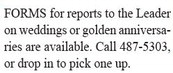 FORMS for reports to the Leader on weddings or golden anniversaries are available. Call 487-5303, or drop in to pick one up. FORMS for reports to the Leader on weddings or golden anniversaries are available. Call 487-5303, or drop in to pick one up.