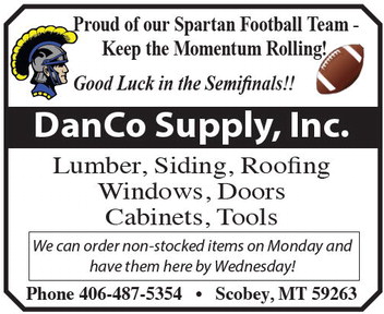 Proud of our Spartan Football Team Keep the Momentum Rolling! Good Luck in the Semifinals!! DanCo Supply, Inc. Lumber, Siding, Roofing Windows, Doors Cabinets, Tools Phone 406-487-5354 • Scobey, MT 59263 We can order non-stocked items on Monday and have them here by Wednesday! Proud of our Spartan Football Team Keep the Momentum Rolling! Good Luck in the Semifinals!! DanCo Supply, Inc. Lumber, Siding, Roofing Windows, Doors Cabinets, Tools Phone 406-487-5354 • Scobey, MT 59263 We can order non-stocked items on Monday and have them here by Wednesday!