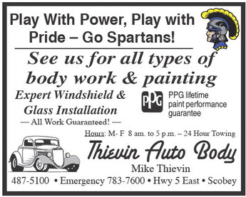 Play With Power, Play with Pride – Go Spartans! See us for all types of body work & painting Expert Windshield & Glass Installation –– All Work Guaranteed! –– Hours: M- F 8 am. to 5 p.m. – 24 Hour Towing Thievin Auto Body Mike Thievin 487-5100 • Emergency 783-7600 • Hwy 5 East • Scobey Play With Power, Play with Pride – Go Spartans! See us for all types of body work & painting Expert Windshield & Glass Installation –– All Work Guaranteed! –– Hours: M- F 8 am. to 5 p.m. – 24 Hour Towing Thievin Auto Body Mike Thievin 487-5100 • Emergency 783-7600 • Hwy 5 East • Scobey