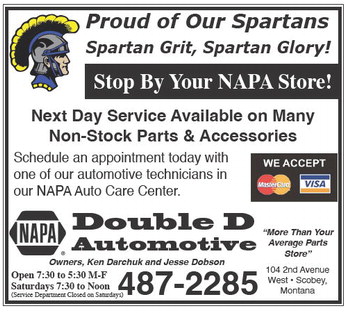 Proud of Our Spartans Spartan Grit, Spartan Glory! Stop By Your NAPA Store! Next Day Service Available on Many Non-Stock Parts & Accessories Schedule an appointment today with one of our automotive technicians in our NAPA Auto Care Center. Double D Automotive Owners, Ken Darchuk and Jesse Dobson “More Than Your Average Parts Store” 104 2nd Avenue West • Scobey, Montana Open 7:30 to 5:30 M-F Saturdays 7:30 to Noon (Service Department Closed on Saturdays) 487-2285 Proud of Our Spartans Spartan Grit, Spartan Glory! Stop By Your NAPA Store! Next Day Service Available on Many Non-Stock Parts & Accessories Schedule an appointment today with one of our automotive technicians in our NAPA Auto Care Center. Double D Automotive Owners, Ken Darchuk and Jesse Dobson “More Than Your Average Parts Store” 104 2nd Avenue West • Scobey, Montana Open 7:30 to 5:30 M-F Saturdays 7:30 to Noon (Service Department Closed on Saturdays) 487-2285