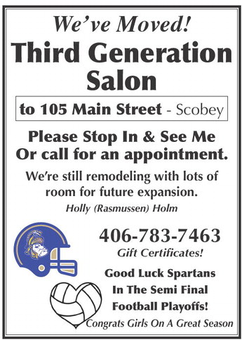 We’ve Moved! Third Generation Salon to 105 Main Street - Scobey Please Stop In & See Me Or call for an appointment. We’re still remodeling with lots of room for future expansion. Holly (Rasmussen) Holm 406-783-7463 Gift Certificates! Good Luck Spartans In The Semi Final Football Playoffs! Congrats Girls On A Great Season We’ve Moved! Third Generation Salon to 105 Main Street - Scobey Please Stop In & See Me Or call for an appointment. We’re still remodeling with lots of room for future expansion. Holly (Rasmussen) Holm 406-783-7463 Gift Certificates! Good Luck Spartans In The Semi Final Football Playoffs! Congrats Girls On A Great Season