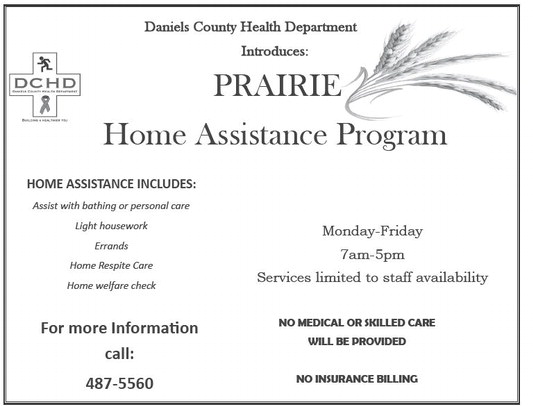 Daniels County Health Department Introduces: PRAIRIE Home Assistance Program HOME ASSISTANCE INCLUDES: Assist with bathing or personal care Light housework Errands Beginning January 1, 2020 Monday-Friday 7am-5pm Services limited to staff availability Home Respite Care Home welfare check NO MEDICAL OR SKILLED CARE WILL BE PROVIDED For more Information call: 487-5560 NO INSURANCE BILLING Daniels County Health Department Introduces: PRAIRIE Home Assistance Program HOME ASSISTANCE INCLUDES: Assist with bathing or personal care Light housework Errands Beginning January 1, 2020 Monday-Friday 7am-5pm Services limited to staff availability Home Respite Care Home welfare check NO MEDICAL OR SKILLED CARE WILL BE PROVIDED For more Information call: 487-5560 NO INSURANCE BILLING