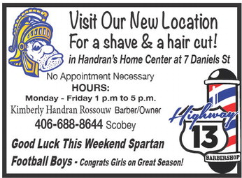Visit Our New Location For a shave & a hair cut! in Handran’s Home Center at 7 Daniels St No Appointment Necessary HOURS: Monday - Friday 1 p.m to 5 p.m. Kimberly Handran Rossouw Barber/Owner 406-688-8644 Scobey Good Luck This Weekend Spartan Football Boys - Congrats Girls on Great Season! Visit Our New Location For a shave & a hair cut! in Handran’s Home Center at 7 Daniels St No Appointment Necessary HOURS: Monday - Friday 1 p.m to 5 p.m. Kimberly Handran Rossouw Barber/Owner 406-688-8644 Scobey Good Luck This Weekend Spartan Football Boys - Congrats Girls on Great Season!