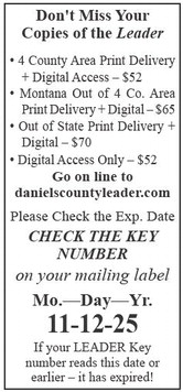Don't Miss Your Copies of the Leader • 4 County Area Print Delivery + Digital Access – $52 • Montana Out of 4 Co. Area Print Delivery + Digital – $65 • Out of State Print Delivery + Digital – $70 • Digital Access Only – $52 Go on line to danielscountyleader.com Please Check the Exp. Date CHECK THE KEY NUMBER on your mailing label Mo.—Day—Yr. 11-12-25 If your LEADER Key number reads this date or earlier – it has expired! Don't Miss Your Copies of the Leader • 4 County Area Print Delivery + Digital Access – $52 • Montana Out of 4 Co. Area Print Delivery + Digital – $65 • Out of State Print Delivery + Digital – $70 • Digital Access Only – $52 Go on line to danielscountyleader.com Please Check the Exp. Date CHECK THE KEY NUMBER on your mailing label Mo.—Day—Yr. 11-12-25 If your LEADER Key number reads this date or earlier – it has expired!