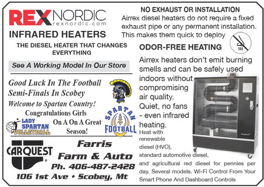 NO EXHAUST OR INSTALLATION Airrex diesel heaters do not require a fixed exhaust pipe or any permanent installation. This makes them quick to deploy INFRARED HEATERS THE DIESEL HEATER THAT CHANGES EVERYTHING ODOR-FREE HEATING See A Working Model In Our Store Good Luck In The Football Semi-Finals In Scobey Welcome to Spartan Country! Congratulations Girls SPARTAN LADY Airrex heaters don’t emit burning smells and can be safely used indoors without compromising air quality. Quiet, no fans - even infrared heating. Heat with renewable diesel (HVO), standard automotive diesel, and agricultural red diesel for pennies per day. Several models. Wi-Fi Control From Your Smart Phone And Dashboard Controls SPARTAN On A On A Great Season! VOLLEYBALL NO EXHAUST OR INSTALLATION Airrex diesel heaters do not require a fixed exhaust pipe or any permanent installation. This makes them quick to deploy INFRARED HEATERS THE DIESEL HEATER THAT CHANGES EVERYTHING ODOR-FREE HEATING See A Working Model In Our Store Good Luck In The Football Semi-Finals In Scobey Welcome to Spartan Country! Congratulations Girls SPARTAN LADY Airrex heaters don’t emit burning smells and can be safely used indoors without compromising air quality. Quiet, no fans - even infrared heating. Heat with renewable diesel (HVO), standard automotive diesel, and agricultural red diesel for pennies per day. Several models. Wi-Fi Control From Your Smart Phone And Dashboard Controls SPARTAN On A On A Great Season! VOLLEYBALL