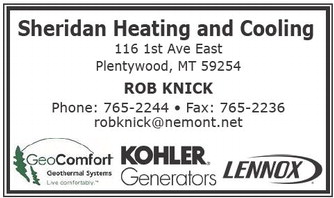Sports Posted on November 19, 2025 Posted on November 19, 2025 Sheridan Heating and Cooling 116 1st Ave East Plentywood, MT 59254 ROB KNICK Phone: 765-2244 • Fax: 765-2236 robknick@nemont.net Sheridan Heating and Cooling 116 1st Ave East Plentywood, MT 59254 ROB KNICK Phone: 765-2244 • Fax: 765-2236 robknick@nemont.net