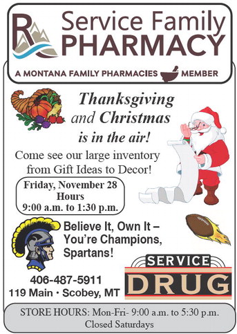 Thanksgiving and Christmas is in the air! Come see our large inventory from Gift Ideas to Decor! Friday, November 28 Hours 9:00 a.m. to 1:30 p.m. Believe It, Own It – You’re Champions, Spartans! 406-487-5911 119 Main • Scobey, MT 487-5911 • 119 Main • Scobey, MT STORE HOURS: Mon-Fri- 9:00 a.m. to 5:30 p.m. Closed Saturdays Thanksgiving and Christmas is in the air! Come see our large inventory from Gift Ideas to Decor! Friday, November 28 Hours 9:00 a.m. to 1:30 p.m. Believe It, Own It – You’re Champions, Spartans! 406-487-5911 119 Main • Scobey, MT 487-5911 • 119 Main • Scobey, MT STORE HOURS: Mon-Fri- 9:00 a.m. to 5:30 p.m. Closed Saturdays