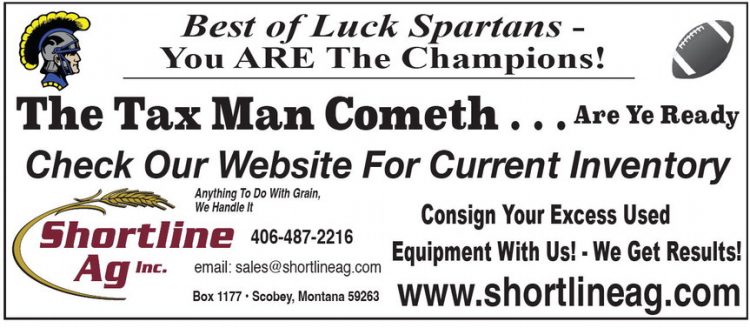 Best of Luck Spartans You ARE The Champions! The Tax Man Cometh . . . Are Ye Ready Check Our Website For Current Inventory Anything To Do With Grain, We Handle It Consign Your Excess Used Equipment With Us! - We Get Results! 406-487-2216 email: sales@shortlineag.com Box 1177 • Scobey, Montana 59263 www.shortlineag.com Best of Luck Spartans You ARE The Champions! The Tax Man Cometh . . . Are Ye Ready Check Our Website For Current Inventory Anything To Do With Grain, We Handle It Consign Your Excess Used Equipment With Us! - We Get Results! 406-487-2216 email: sales@shortlineag.com Box 1177 • Scobey, Montana 59263 www.shortlineag.com