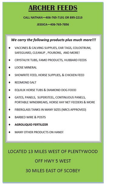 MANY OTHER PRODUCTS ON HAND! AGROLIQUID FERTILIZER BARBED WIRE & POSTS FIBERGLASS TANKS IN MANY SIZES (NRCS APPROVED) GATES, PANELS, SUPERSTEEL, CONTINUOUS PANELS, PORTABLE WINDBREAKS, HORSE HAY NET FEEDERS & MORE EQUILIX HORSE TUBS & DIAMOND DOG FOOD REDMOND SALT SHOWRITE FEED, HORSE SUPPLIES, & CHICKEN FEED LOOSE MINERAL CRYSTALYX TUBS, FAMO PRODUCTS, HUBBARD FEEDS We carry the following products plus much more!!! VACCINES & CALVING SUPPLIES, EAR TAGS, COLOSTRUM, SAFEGUARD, CLEANUP , POURONS, AND MORE! 30 MILES EAST OF SCOBEY OFF HWY 5 WEST LOCATED 13 MILES WEST OF PLENTYWOOD JESSICA—406-765-7856 895-2213 OR NATHAN—406-765-7191 CALL ARCHER FEEDS first the for here Appearing Country Wife & Husband Fri., Aug. 29 • 6- 9 pm Town” Page Leavin’ “ Live Music MANY OTHER PRODUCTS ON HAND! AGROLIQUID FERTILIZER BARBED WIRE & POSTS FIBERGLASS TANKS IN MANY SIZES (NRCS APPROVED) GATES, PANELS, SUPERSTEEL, CONTINUOUS PANELS, PORTABLE WINDBREAKS, HORSE HAY NET FEEDERS & MORE EQUILIX HORSE TUBS & DIAMOND DOG FOOD REDMOND SALT SHOWRITE FEED, HORSE SUPPLIES, & CHICKEN FEED LOOSE MINERAL CRYSTALYX TUBS, FAMO PRODUCTS, HUBBARD FEEDS We carry the following products plus much more!!! VACCINES & CALVING SUPPLIES, EAR TAGS, COLOSTRUM, SAFEGUARD, CLEANUP , POURONS, AND MORE! 30 MILES EAST OF SCOBEY OFF HWY 5 WEST LOCATED 13 MILES WEST OF PLENTYWOOD JESSICA—406-765-7856 895-2213 OR NATHAN—406-765-7191 CALL ARCHER FEEDS first the for here Appearing Country Wife & Husband Fri., Aug. 29 • 6- 9 pm Town” Page Leavin’ “ Live Music