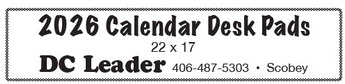 News Posted on November 19, 2025 Posted on November 19, 2025 2026 Calendar Desk Pads 22 x 17 DC Leader 406-487-5303 • Scobey 2026 Calendar Desk Pads 22 x 17 DC Leader 406-487-5303 • Scobey