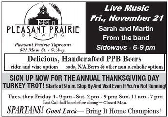 Live Music Fri., November 21 Sarah and Martin From the band Sideways - 6-9 pm Pleasant Prairie Taproom 601 Main St. - Scobey Delicious, Handcrafted PPB Beers —cider and wine options — soda, N/A Beers & other non-alcoholic options SIGN UP NOW FOR THE ANNUAL THANKSGIVING DAY TURKEY TROT! Starts at 9 a.m. Stop By And Visit Even If You’re Not Running! Tues. thru Friday 4 - 9 pm - Sat. 2 pm - 9 pm; Sun. 11 am - 7 pm Last Call -half hour before closing — Closed Mon. SPARTANS! Good Luck— Bring It Home Champions! Live Music Fri., November 21 Sarah and Martin From the band Sideways - 6-9 pm Pleasant Prairie Taproom 601 Main St. - Scobey Delicious, Handcrafted PPB Beers —cider and wine options — soda, N/A Beers & other non-alcoholic options SIGN UP NOW FOR THE ANNUAL THANKSGIVING DAY TURKEY TROT! Starts at 9 a.m. Stop By And Visit Even If You’re Not Running! Tues. thru Friday 4 - 9 pm - Sat. 2 pm - 9 pm; Sun. 11 am - 7 pm Last Call -half hour before closing — Closed Mon. SPARTANS! Good Luck— Bring It Home Champions!