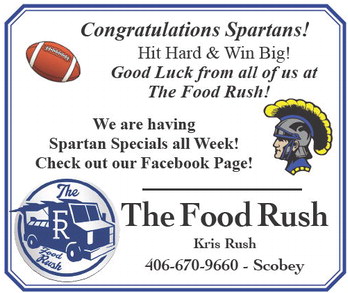 Congratulations Spartans! Hit Hard & Win Big! Good Luck from all of us at The Food Rush! We are having Spartan Specials all Week! Check out our Facebook Page! TheFoodRush Kris Rush 406-670-9660 - Scobey Congratulations Spartans! Hit Hard & Win Big! Good Luck from all of us at The Food Rush! We are having Spartan Specials all Week! Check out our Facebook Page! TheFoodRush Kris Rush 406-670-9660 - Scobey