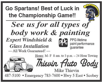 Go Spartans! Best of Luck in the Championship Game!! See us for all types of body work & painting Expert Windshield & Glass Installation –– All Work Guaranteed! –– Hours: M- F 8 am. to 5 p.m. – 24 Hour Towing Thievin Auto Body Mike Thievin 487-5100 • Emergency 783-7600 • Hwy 5 East • Scobey Go Spartans! Best of Luck in the Championship Game!! See us for all types of body work & painting Expert Windshield & Glass Installation –– All Work Guaranteed! –– Hours: M- F 8 am. to 5 p.m. – 24 Hour Towing Thievin Auto Body Mike Thievin 487-5100 • Emergency 783-7600 • Hwy 5 East • Scobey