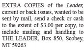 EXTRA COPIES of the Leader, current or back issues, wanted to be sent by mail, send a check or cash to the extent of $3.00 per copy, to include mailing and handling to THE LEADER, Box 850, Scobey, MT 59263 EXTRA COPIES of the Leader, current or back issues, wanted to be sent by mail, send a check or cash to the extent of $3.00 per copy, to include mailing and handling to THE LEADER, Box 850, Scobey, MT 59263