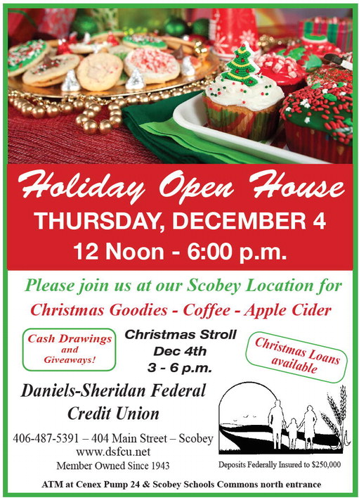 Holiday Open House THURSDAY, DECEMBER 4 12 Noon - 6:00 p.m. Please join us at our Scobey Location for Christmas Goodies - Coffee - Apple Cider Cash Drawings and Giveaways! Christmas Stroll Dec 4th 3 - 6 p.m. Christmas Loans available Daniels-Sheridan Federal Credit Union 406-487-5391 – 404 Main Street – Scobey www.dsfcu.net Member Owned Since 1943 Deposits Federally Insured to $250,000 ATM at Cenex Pump 24 & Scobey Schools Commons north entrance Holiday Open House THURSDAY, DECEMBER 4 12 Noon - 6:00 p.m. Please join us at our Scobey Location for Christmas Goodies - Coffee - Apple Cider Cash Drawings and Giveaways! Christmas Stroll Dec 4th 3 - 6 p.m. Christmas Loans available Daniels-Sheridan Federal Credit Union 406-487-5391 – 404 Main Street – Scobey www.dsfcu.net Member Owned Since 1943 Deposits Federally Insured to $250,000 ATM at Cenex Pump 24 & Scobey Schools Commons north entrance