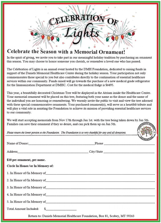 Celebrate the Season with a Memorial Ornament! Celebrate the Season with a Memorial Ornament! In the spirit of giving, we invite you to take part in our meaningful holiday tradition by purchasing an ornament this season. You may choose to honor someone you cherish, or remember a loved one who has passed. The Celebration of Lights is an annual event hosted by the DMH Foundation, dedicated to raising funds in support of the Daniels Memorial Healthcare Center during the holiday season. Your participation not only commemorates those special to you but also contributes directly to the continuation of essential healthcare services within our community. Funds raised will go towards the purchase of a new medical grade refrigerator for the Immunization Department at DMHC. Cost for the medical fridge is $6495. This year, a beautifully decorated Christmas Tree will be displayed in the Atrium inside the Healthcare Center. Your memorial ornament will be placed on this tree, featuring both your name as the donor and the name of the individual you are honoring or remembering. We warmly invite the public to visit and view the tree adorned with these special commemorative ornaments. Your purchased ornament(s), will serve as a heartfelt tribute and will play a vital role in assisting the Foundation to achieve its mission of providing essential healthcare services to our community. We will start accepting memorials from Nov 17th through Jan 1st. with the tree being taken down by Jan 5th. Families can save their ornament if they so desire, and can pick them up on Jan 5th. Please return the lower portion to the Foundation. The Foundation is so very thankful for any and all donations. Name of Donor:___________________________________________Phone _________________________________ Address______________________________________________ City/State _________________________________ $10 per ornament, per name. Circle In Honor/or In Memory of: 1. In Honor of/In Memory of_______________________________________________________________________ 2. In Honor of/In Memory of_______________________________________________________________________ 3. In Honor of/In Memory of_______________________________________________________________________ 4. In Honor of/In Memory of_______________________________________________________________________ 5. In Honor of/In Memory of_______________________________________________________________________ Total Amount Included: $____________________ Return to: Daniels Memorial Healthcare Foundation, Box 81, Scobey, MT 59263 Celebrate the Season with a Memorial Ornament! Celebrate the Season with a Memorial Ornament! In the spirit of giving, we invite you to take part in our meaningful holiday tradition by purchasing an ornament this season. You may choose to honor someone you cherish, or remember a loved one who has passed. The Celebration of Lights is an annual event hosted by the DMH Foundation, dedicated to raising funds in support of the Daniels Memorial Healthcare Center during the holiday season. Your participation not only commemorates those special to you but also contributes directly to the continuation of essential healthcare services within our community. Funds raised will go towards the purchase of a new medical grade refrigerator for the Immunization Department at DMHC. Cost for the medical fridge is $6495. This year, a beautifully decorated Christmas Tree will be displayed in the Atrium inside the Healthcare Center. Your memorial ornament will be placed on this tree, featuring both your name as the donor and the name of the individual you are honoring or remembering. We warmly invite the public to visit and view the tree adorned with these special commemorative ornaments. Your purchased ornament(s), will serve as a heartfelt tribute and will play a vital role in assisting the Foundation to achieve its mission of providing essential healthcare services to our community. We will start accepting memorials from Nov 17th through Jan 1st. with the tree being taken down by Jan 5th. Families can save their ornament if they so desire, and can pick them up on Jan 5th. Please return the lower portion to the Foundation. The Foundation is so very thankful for any and all donations. Name of Donor:___________________________________________Phone _________________________________ Address______________________________________________ City/State _________________________________ $10 per ornament, per name. Circle In Honor/or In Memory of: 1. In Honor of/In Memory of_______________________________________________________________________ 2. In Honor of/In Memory of_______________________________________________________________________ 3. In Honor of/In Memory of_______________________________________________________________________ 4. In Honor of/In Memory of_______________________________________________________________________ 5. In Honor of/In Memory of_______________________________________________________________________ Total Amount Included: $____________________ Return to: Daniels Memorial Healthcare Foundation, Box 81, Scobey, MT 59263