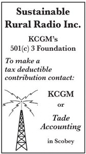 Sustainable Rural Radio Inc. KCGM’s 501(c) 3 Foundation To make a tax deductible contribution contact: KCGM or Tade Accounting in Scobey Sustainable Rural Radio Inc. KCGM’s 501(c) 3 Foundation To make a tax deductible contribution contact: KCGM or Tade Accounting in Scobey