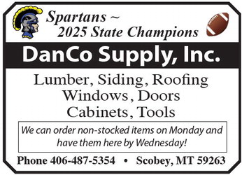Spartans ~ 2025 State Champions DanCo Supply, Inc. Lumber, Siding, Roofing Windows, Doors Cabinets, Tools Phone 406-487-5354 • Scobey, MT 59263 We can order non-stocked items on Monday and have them here by Wednesday! Spartans ~ 2025 State Champions DanCo Supply, Inc. Lumber, Siding, Roofing Windows, Doors Cabinets, Tools Phone 406-487-5354 • Scobey, MT 59263 We can order non-stocked items on Monday and have them here by Wednesday!
