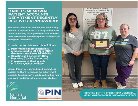 DANIELS MEMORIAL PATIENT ACCOUNTS DEPARTMENT RECENTLY RECEIVED A PIN AWARD! This award reflects our commitment to improving both the quality and financial viability of healthcare in our community. Through collaboration and hard work we continue to enhance patient outcomes and strengthen rural health. Criteria met for this award is as follows: Performance Improvement in a project related to MT PIN or MBQIP data measures: Financial Viability Complete and Consistent Data Reporting (Quality Committee) Engagement & Sharing with MT CAHs (Quality Comittee) A huge thank you to our dedicated team whose passion and hard work make this achievement possible. Together, we’re building a healthier future, one quality and financial improvement at a time. PICTURED LEFT TO RIGHT: TRINA VONDERAU, MARYLYNN BLOMQUIST, AND ASHLEY LEFLER DANIELS MEMORIAL PATIENT ACCOUNTS DEPARTMENT RECENTLY RECEIVED A PIN AWARD! This award reflects our commitment to improving both the quality and financial viability of healthcare in our community. Through collaboration and hard work we continue to enhance patient outcomes and strengthen rural health. Criteria met for this award is as follows: Performance Improvement in a project related to MT PIN or MBQIP data measures: Financial Viability Complete and Consistent Data Reporting (Quality Committee) Engagement & Sharing with MT CAHs (Quality Comittee) A huge thank you to our dedicated team whose passion and hard work make this achievement possible. Together, we’re building a healthier future, one quality and financial improvement at a time. PICTURED LEFT TO RIGHT: TRINA VONDERAU, MARYLYNN BLOMQUIST, AND ASHLEY LEFLER