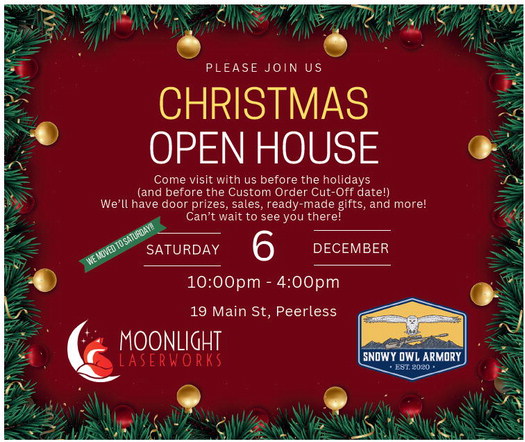 PLEASE JOIN US CHRISTMAS OPEN HOUSE Come visit with us before the holidays (and before the Custom Order Cut-Off date!) We’ll have door prizes, sales, ready-made gifts, and more! Can’t wait to see you there! to saturday!! SATURDAY 6 DECEMBER we moved 10:00pm - 4:00pm 19 Main St, Peerless PLEASE JOIN US CHRISTMAS OPEN HOUSE Come visit with us before the holidays (and before the Custom Order Cut-Off date!) We’ll have door prizes, sales, ready-made gifts, and more! Can’t wait to see you there! to saturday!! SATURDAY 6 DECEMBER we moved 10:00pm - 4:00pm 19 Main St, Peerless