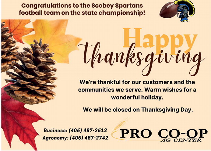 Congratulations to the Scobey Spartans football team on the state championship! ThanHksagpivpinyg We’re thankful for our customers and the communities we serve. Warm wishes for a wonderful holiday. We will be closed on Thanksgiving Day. Business: (406) 487-2612 Agronomy: (406) 487-2742 Congratulations to the Scobey Spartans football team on the state championship! ThanHksagpivpinyg We’re thankful for our customers and the communities we serve. Warm wishes for a wonderful holiday. We will be closed on Thanksgiving Day. Business: (406) 487-2612 Agronomy: (406) 487-2742