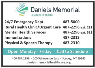 487-5000 24/7 Emergency Dept 487-2296 ext. 221 487-2296 ext. 312 24/7 Emergency Dept Rural Health Clinic/Urgent Care Mental Health Services Immunizations Physical & Speech Therapy 487-2313 487-2310 Open Monday - Friday Call to Schedule 406.487.2296 ∙ 105 5th Avenue East ∙ Scobey, MT 59263 danielsmemorialhealthcare.org 487-5000 24/7 Emergency Dept 487-2296 ext. 221 487-2296 ext. 312 24/7 Emergency Dept Rural Health Clinic/Urgent Care Mental Health Services Immunizations Physical & Speech Therapy 487-2313 487-2310 Open Monday - Friday Call to Schedule 406.487.2296 ∙ 105 5th Avenue East ∙ Scobey, MT 59263 danielsmemorialhealthcare.org