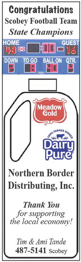 Congratulations Scobey Football Team State Champions 48 16 Northern Border Distributing, Inc. Thank You for supporting the local economy! Tim & Ami Tande 487-5141 Scobey Congratulations Scobey Football Team State Champions 48 16 Northern Border Distributing, Inc. Thank You for supporting the local economy! Tim & Ami Tande 487-5141 Scobey