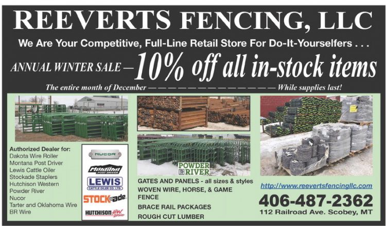 REEVERTS FENCING, LLC We Are Your Competitive, Full-Line Retail Store For Do-It-Yourselfers ... ANNUAL WINTER SALE — 10% off all in-stock items The entire month of December While supplies last! IPOWDERI uriver: Authorized Dealer for: Dakota Wire Roller Montana Post Driver Lewis Cattle Oiler Stockade Staplers Hutchison Western Powder River Nucor Tarter and Oklahoma Wire BR Wire LEWIS ( CATTLE OILER CO. LTD.) h ttoiHwww. reevertsfencinallc. com STOCKS* GATES AND PANELS - all sizes & styles WOVEN WIRE, HORSE, & GAME FENCE BRACE RAIL PACKAGES ROUGH CUT LUMBER 406-487-2362 HUTIHI50I1 112 Railroad Ave. Scobey, MT REEVERTS FENCING, LLC We Are Your Competitive, Full-Line Retail Store For Do-It-Yourselfers ... ANNUAL WINTER SALE — 10% off all in-stock items The entire month of December While supplies last! IPOWDERI uriver: Authorized Dealer for: Dakota Wire Roller Montana Post Driver Lewis Cattle Oiler Stockade Staplers Hutchison Western Powder River Nucor Tarter and Oklahoma Wire BR Wire LEWIS ( CATTLE OILER CO. LTD.) h ttoiHwww. reevertsfencinallc. com STOCKS* GATES AND PANELS - all sizes & styles WOVEN WIRE, HORSE, & GAME FENCE BRACE RAIL PACKAGES ROUGH CUT LUMBER 406-487-2362 HUTIHI50I1 112 Railroad Ave. Scobey, MT