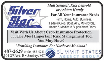 Matt Stentoft, Kiki Lekvold or Ashton Handy Silver V. SlarÙ For All Your Insurance Needs Farm, Home, Auto, Business, Federal Crop, Boat, ATV, Motorcycle, Health & Medicare Supplement Plans tllbmsMSM Visit With Us About Crop Insurance Protection . . . The Most Important Risk Management Tool You May Have! 'Providing Insurance For Northeast Montana' 487-2629 or fax 487-5931 SUMMIT STATES 104 2nd Ave. E • Scobey, MT # AGENÇ^ROU^ Matt Stentoft, Kiki Lekvold or Ashton Handy Silver V. SlarÙ For All Your Insurance Needs Farm, Home, Auto, Business, Federal Crop, Boat, ATV, Motorcycle, Health & Medicare Supplement Plans tllbmsMSM Visit With Us About Crop Insurance Protection . . . The Most Important Risk Management Tool You May Have! 'Providing Insurance For Northeast Montana' 487-2629 or fax 487-5931 SUMMIT STATES 104 2nd Ave. E • Scobey, MT # AGENÇ^ROU^
