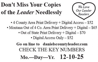 Don't Miss Your Copies of the Leader Needlessly We Love Our Leader Readers • 4 County Area Print Delivery + Digital Access – $52 • Montana Out of 4 Co. Area Print Delivery + Digital – $65 • Out of State Print Delivery + Digital – $70 • Digital Access Only – $52 Go on line to danielscountyleader.com CHECK THE KEY NUMBERS Mo.—Day—Yr. 12-10-25 Don't Miss Your Copies of the Leader Needlessly We Love Our Leader Readers • 4 County Area Print Delivery + Digital Access – $52 • Montana Out of 4 Co. Area Print Delivery + Digital – $65 • Out of State Print Delivery + Digital – $70 • Digital Access Only – $52 Go on line to danielscountyleader.com CHECK THE KEY NUMBERS Mo.—Day—Yr. 12-10-25