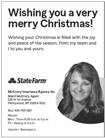 Wishing you a very merry Christmas! Wishing your Christmas is filled with the joy and peace of the season, from my team and I to you and yours. $ 9.95 McCrory Insurance Agency Inc Sherri McCrory, Agent 525 W 1st Avenue Plentywood, MT 59254-1502 Bus: 406-765-1821 Hours: Mon - Thurs 8:30 a.m. to 5 p.m. Fri - closing at 3 p.m. State Farm · Bloomington, IL Wishing you a very merry Christmas! Wishing your Christmas is filled with the joy and peace of the season, from my team and I to you and yours. $ 9.95 McCrory Insurance Agency Inc Sherri McCrory, Agent 525 W 1st Avenue Plentywood, MT 59254-1502 Bus: 406-765-1821 Hours: Mon - Thurs 8:30 a.m. to 5 p.m. Fri - closing at 3 p.m. State Farm · Bloomington, IL