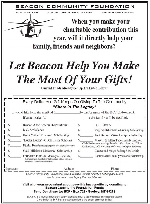 BEACON COMMUNITY FDUNDATIDN P.O. BOX 726 SCDBEY MQNTANA 59263 PH. 4D6-4B7-2292 When you make your charitable contribution this year, will it directly help your family, friends and neighbors? Let Beacon Help You Make The Most Of Your Gifts1r Current Funds Already Set Up Are Listed Below: Every Dollar You Gift Keeps On Giving To The Community 'Share In The Legacy' I would like to make a gift of $_______________________to one/or more of the BCF Endowments: If a memorial (to: _______________________________ ) the family will be notified. Beacon A (or Beacon B-operations) ________ D.C. Library D.C. Ambulance ________ Virginia Miller Music/Nursing Scholarship Doris Mahler Memorial Scholarship ________ Jack Reiner Music Camp Scholarship 'Bucky Bucks' & Dollars for Scholars Bjerke Fund (earnings support area captial projects) ________ Marvin & Ellen Tade Family Endow. (Tade Endowment earnings benefit-10% to Beacon, 10% to Health Care, 10% to County, 60% to Area Capital Projects) ________ Chester and Marge Solberg Scholarship ________ Charles Daniels Family Memorial Scholarship Sue Hellickson Memorial Scholarship Founder's Fund (In Memory of Tom Cote) (Earnings from fund help with travel and related expenses to Daniels County cancer victims) Signature _ _____________________________ Address . Phone _ Beacon Community Foundation strives to make Daniels County a better place to live and to pass on a richer legacy than we inherited. Visit with your accountant about possible tax benefits by donating to Beacon Community Foundation Funds Send Donations to: BCF • Box 726 • Scobey, MT 59263 BCF, Inc. is a Montana non-profit corporation and a 501(c)(3) federal tax exempt organization. Contribution to BCF, Inc. are tax deductible to the extent permitted by law. BEACON COMMUNITY FDUNDATIDN P.O. BOX 726 SCDBEY MQNTANA 59263 PH. 4D6-4B7-2292 When you make your charitable contribution this year, will it directly help your family, friends and neighbors? Let Beacon Help You Make The Most Of Your Gifts1r Current Funds Already Set Up Are Listed Below: Every Dollar You Gift Keeps On Giving To The Community 'Share In The Legacy' I would like to make a gift of $_______________________to one/or more of the BCF Endowments: If a memorial (to: _______________________________ ) the family will be notified. Beacon A (or Beacon B-operations) ________ D.C. Library D.C. Ambulance ________ Virginia Miller Music/Nursing Scholarship Doris Mahler Memorial Scholarship ________ Jack Reiner Music Camp Scholarship 'Bucky Bucks' & Dollars for Scholars Bjerke Fund (earnings support area captial projects) ________ Marvin & Ellen Tade Family Endow. (Tade Endowment earnings benefit-10% to Beacon, 10% to Health Care, 10% to County, 60% to Area Capital Projects) ________ Chester and Marge Solberg Scholarship ________ Charles Daniels Family Memorial Scholarship Sue Hellickson Memorial Scholarship Founder's Fund (In Memory of Tom Cote) (Earnings from fund help with travel and related expenses to Daniels County cancer victims) Signature _ _____________________________ Address . Phone _ Beacon Community Foundation strives to make Daniels County a better place to live and to pass on a richer legacy than we inherited. Visit with your accountant about possible tax benefits by donating to Beacon Community Foundation Funds Send Donations to: BCF • Box 726 • Scobey, MT 59263 BCF, Inc. is a Montana non-profit corporation and a 501(c)(3) federal tax exempt organization. Contribution to BCF, Inc. are tax deductible to the extent permitted by law.